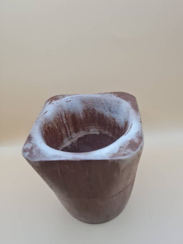 De vaas is gemaakt uit twee blokken tropisch hardhout, afkomstig van een bedrijf dat parkbruggen bouwt.
