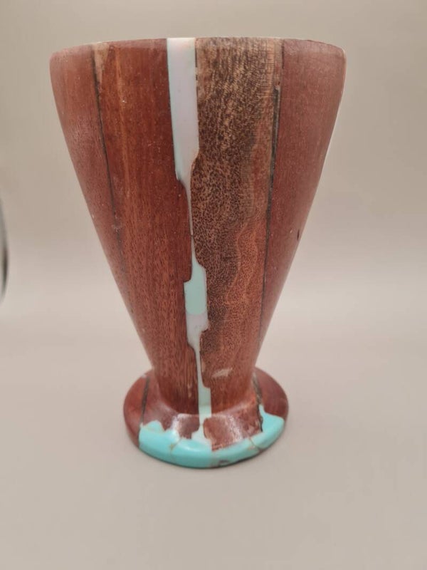 Deze vaas is gedraaid uit stukken hardhout dat overbleef van vloeren houten bruggen aangelegd in parken. de stukken hout zijn tegenelkaar geplakt en de uitsparingen zijn opgevuld met epoxie. De bruggenbouwer gaf aan dat het hout gecertificeerd is.