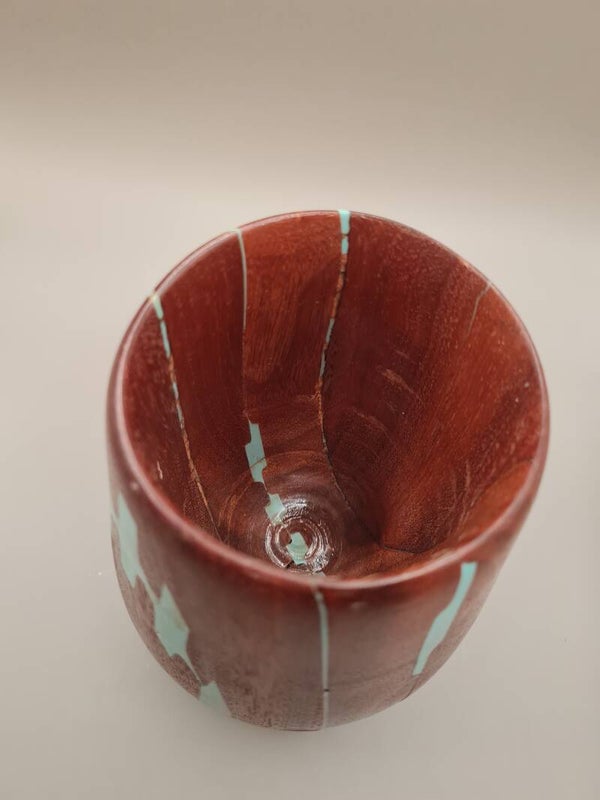Deze vaas is gedraaid uit stukken hardhout dat overbleef van vloeren houten bruggen aangelegd in parken. de stukken hout zijn tegenelkaar geplakt en de uitsparingen zijn opgevuld met epoxie. De bruggenbouwer gaf aan dat het hout gecertificeerd is.