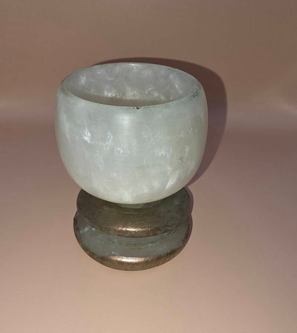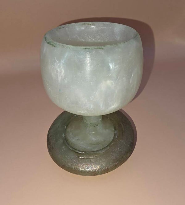 Bokaal gemaakt uit wit, gemarmerd epoxy. de voet is goudkleurig net zo als de ring rond de steel