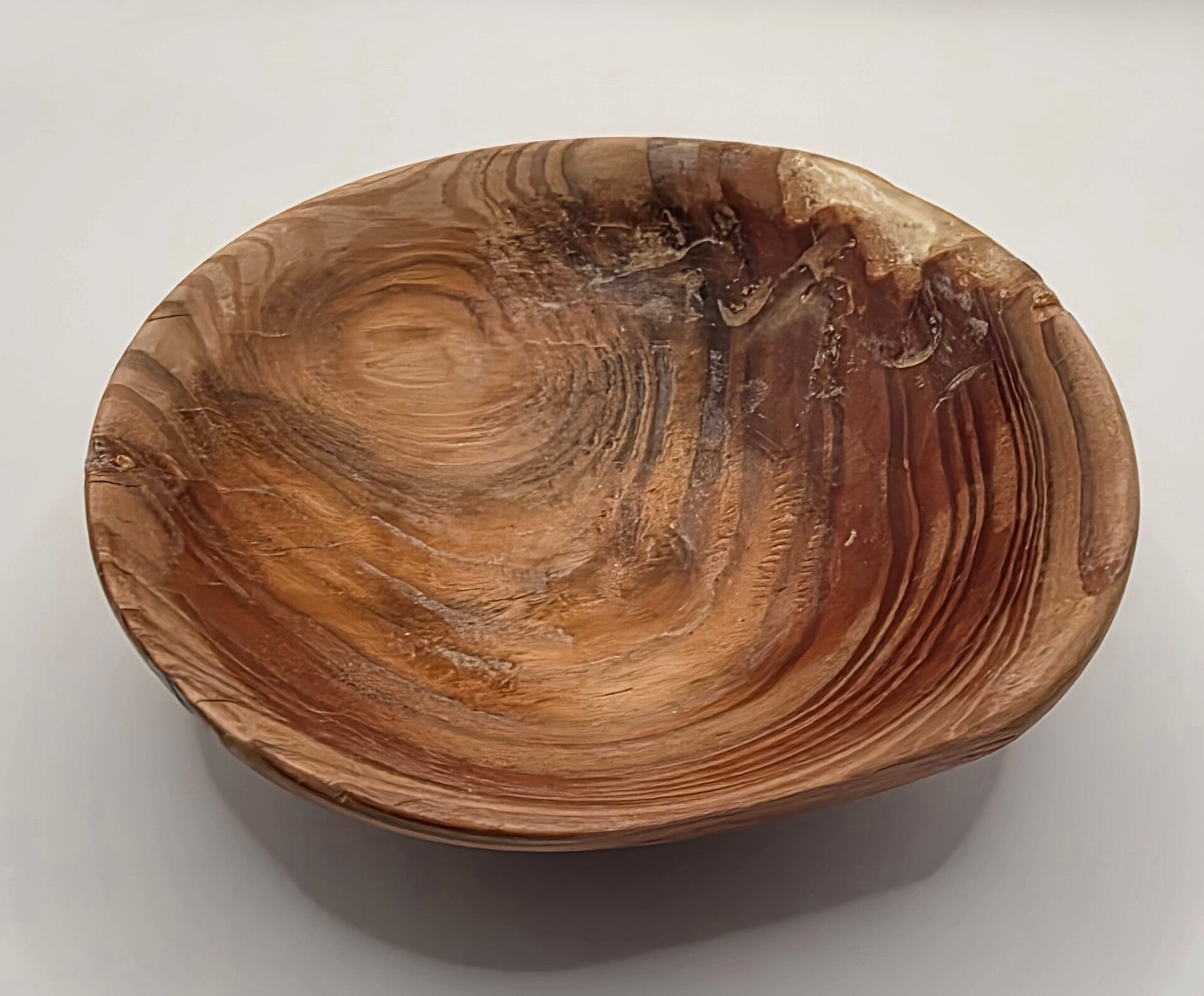 Klein schaaltje gemaakt uit een stuk taksushout. Het schaaltje is niet volledig rond.