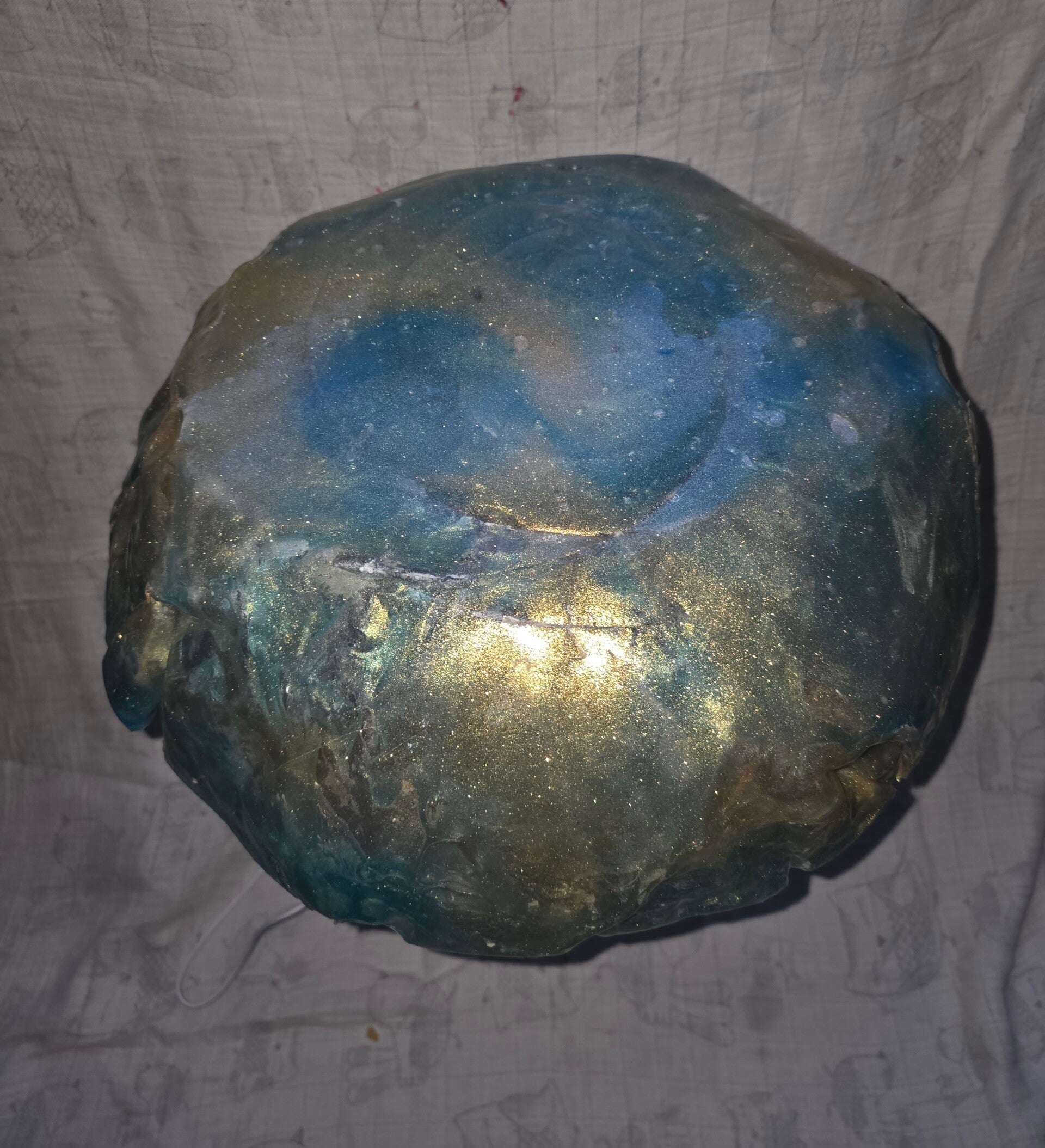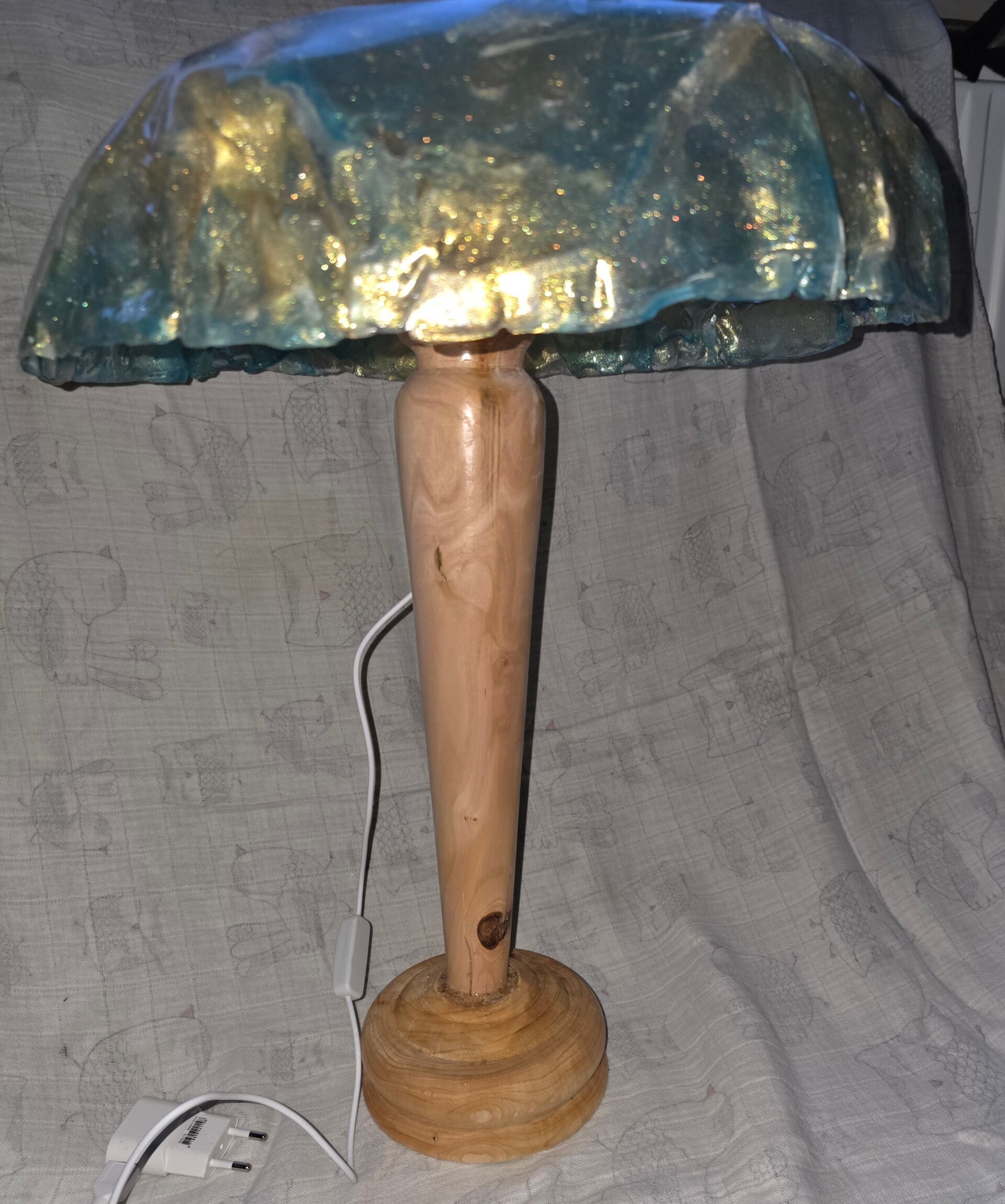Deze grote schemerlamp met ledverlichting heeft een voet van hout van een kersenboom. De kap is gemaakt van groen/goudkleurige epoxy.