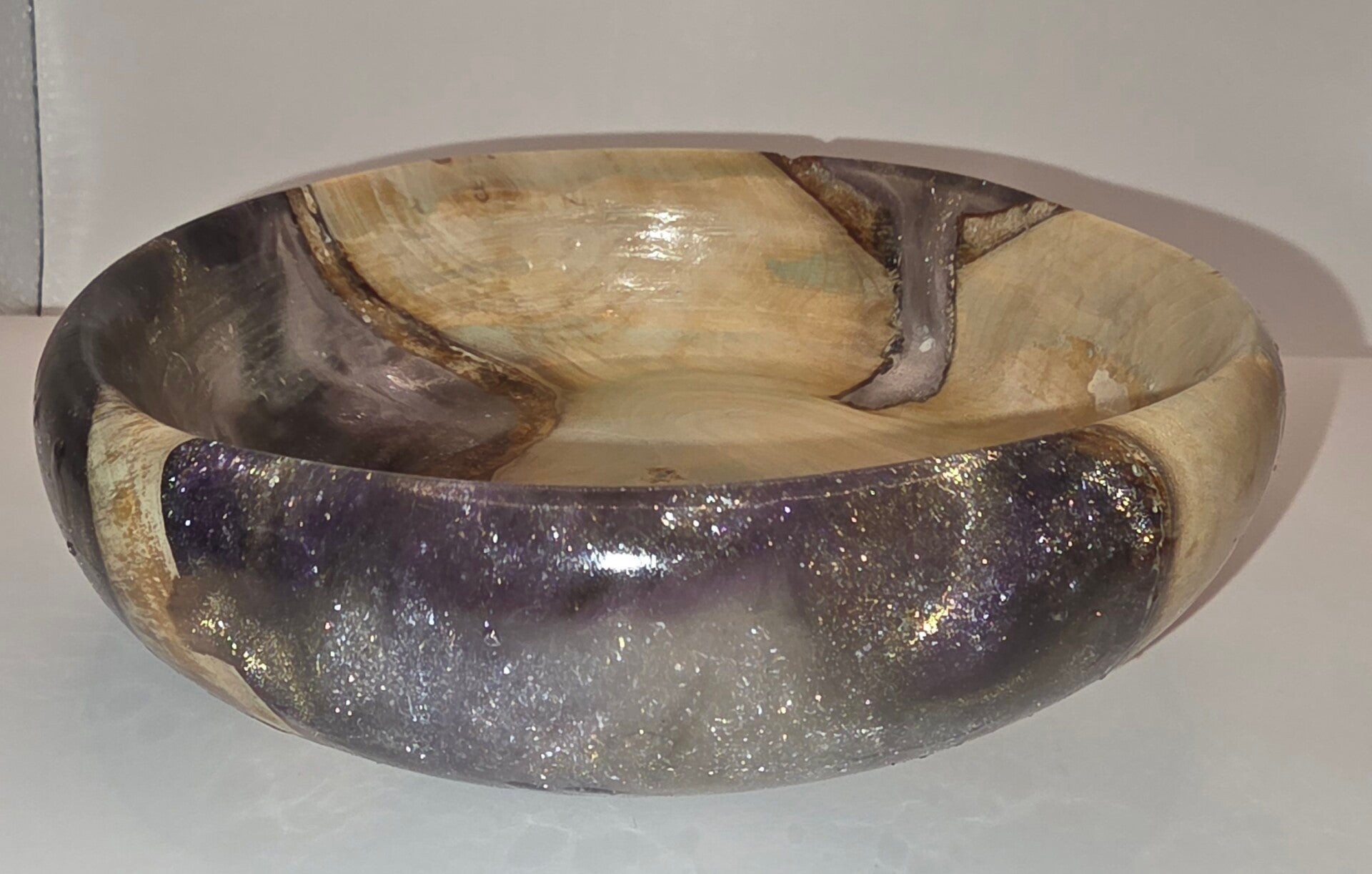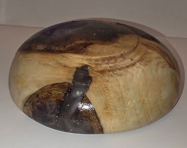 dit schaaltje is gedraaid van een stuk elzenhout met zwate, zilveren en paarse epoxy.