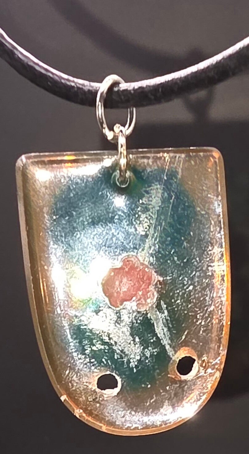 Hanger, gemaakt van epoxy. Kleur is transparant oranje met groene toevoeging en rode stip. Het hangt een een zwartleren ketting met slotje