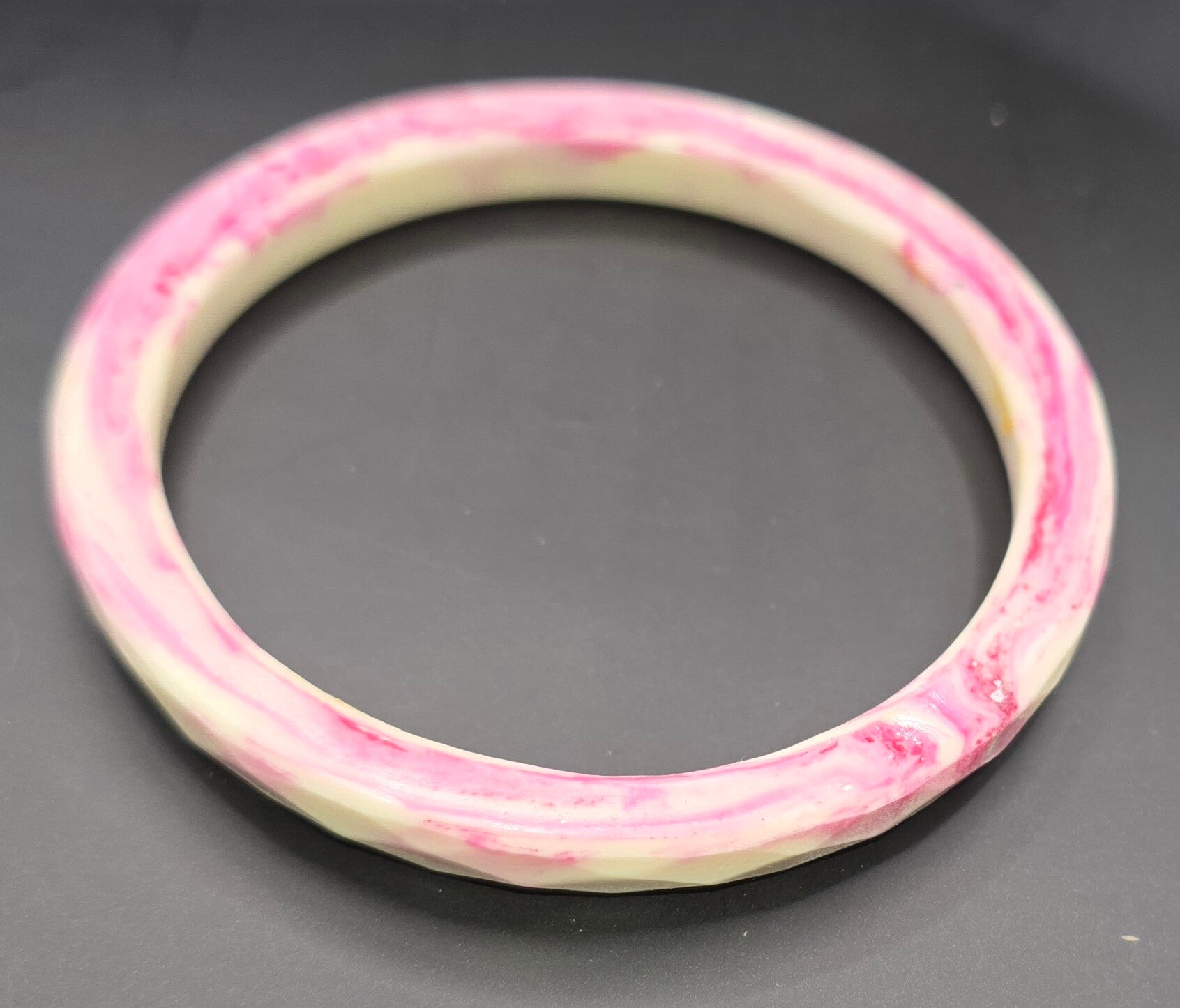 Armband gemaakt van epoxy, kleur wit, waaraan roze verf is toegevoegd, vorm is rond.