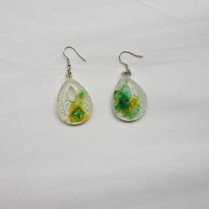 Epoxy oorgangers transparant met groene en gele toevoeging, voorzien van haakjes om in oorgaatjes te hangen.
